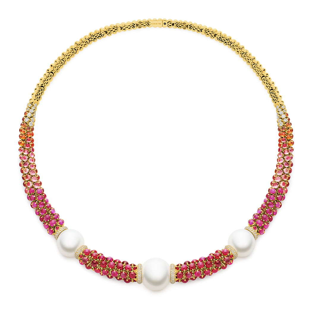 Three lustrous untreated Australian South Sea pearls, revered for their beauty and scarcity, are set within a delicate 18ct yellow gold wheat chain and feature almost 850 stones of hand cut and polished cabochon rubies, orange sapphires, pink tourmalines, and brilliant white diamonds. The result is redolent of luminous moons rising in a sky streaked with saturated colour.