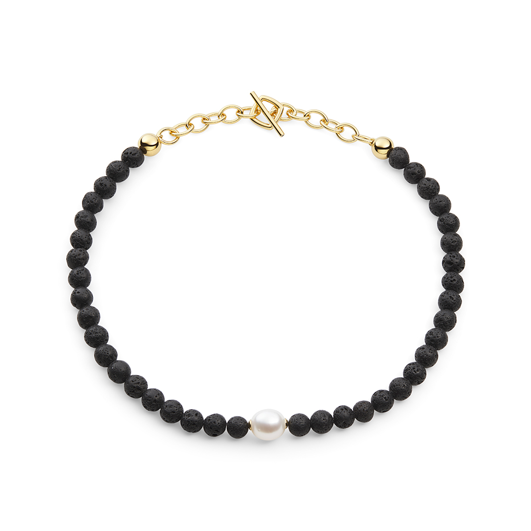 This necklace features charcoal-coloured lava beads, a lustrous Australian South Sea pearl and a gold plated T-bar clasp and chain. Classic Kailis, this piece is designed to work with everyday styling.
