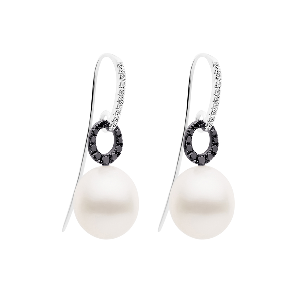 The Angelic French Hook Earrings are the epitome of exquisite and simple design. Two luminous Australian South Sea pearls are perfectly accompanied by elegant french hook earring adorned with shimmering black diamonds.