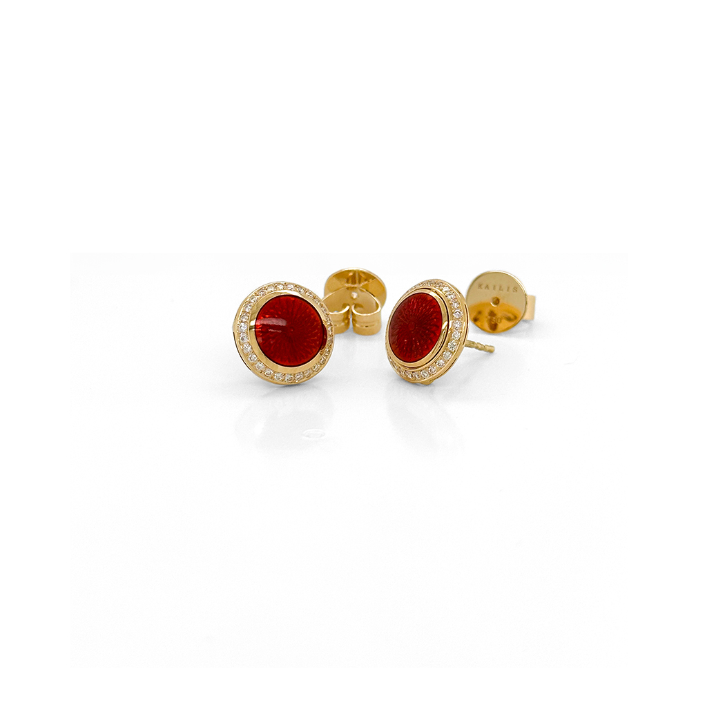 The red Guilloché enamel is surrounded by 0.29cts of sparkling white diamonds set in 18ct yellow gold.