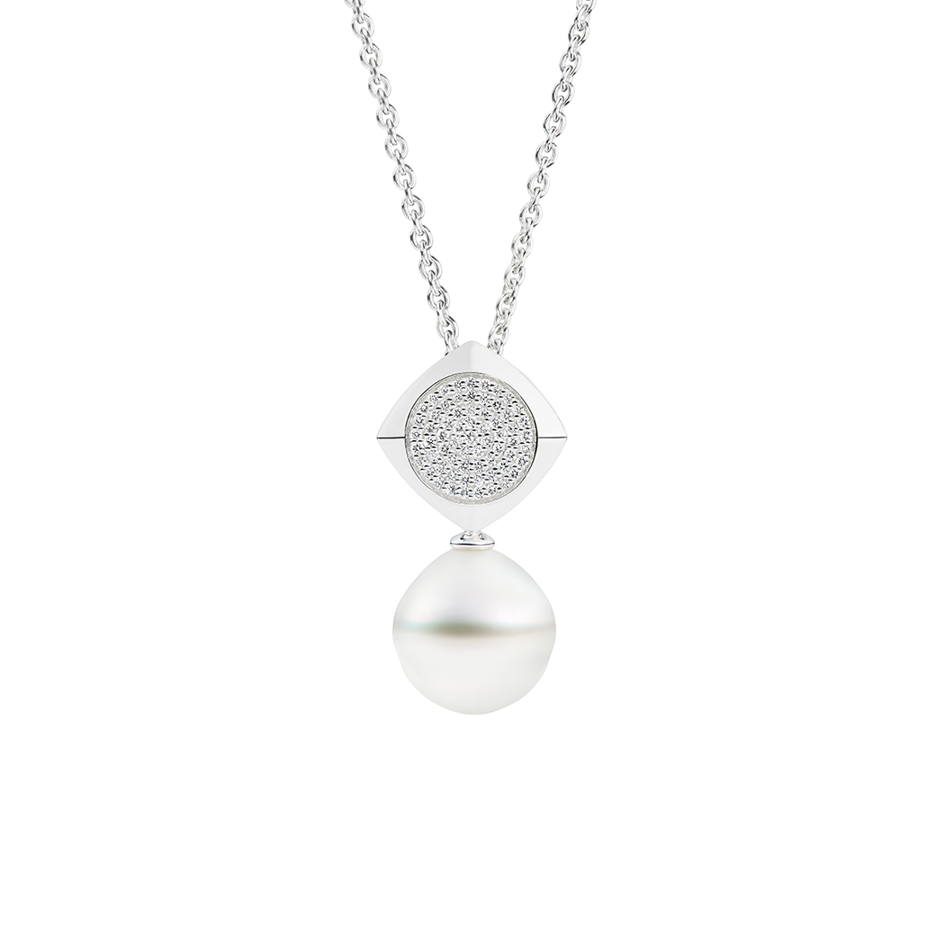 The Astara Pearl Pendant Necklace showcases a lustrous 13mm Australian South Sea pearl suspended from a radiant circle of pavé set white diamonds. Encompassed by a Tetrális element, signature Kailis shape, the entire piece is held by a fine 45cm sterling silver chain.