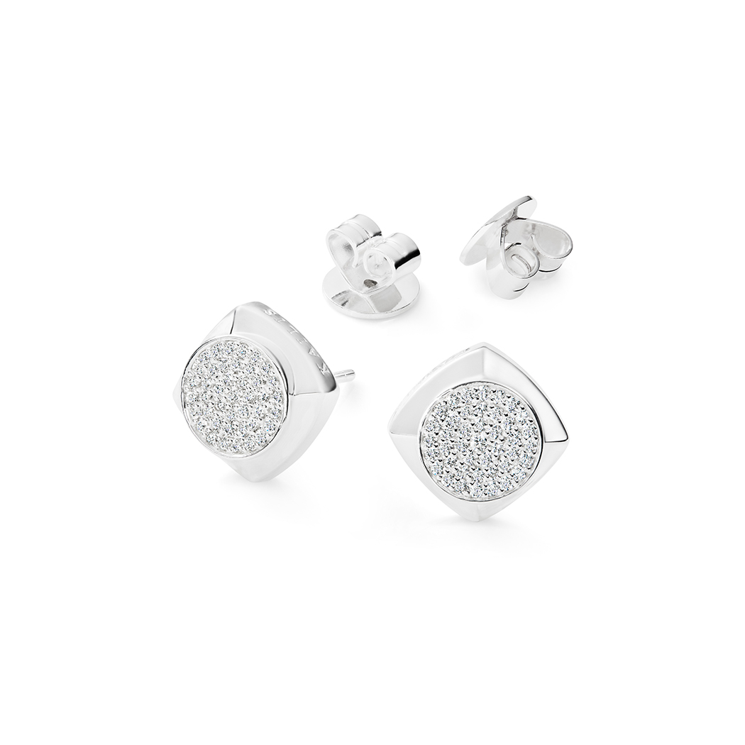Crafted in solid sterling silver, these large studs feature a circle of 0.45 carats of sparkling pavé set white diamonds. This circle is surrounded by a signature Kailis design, the classic Tetrális shape and hallmark logo.