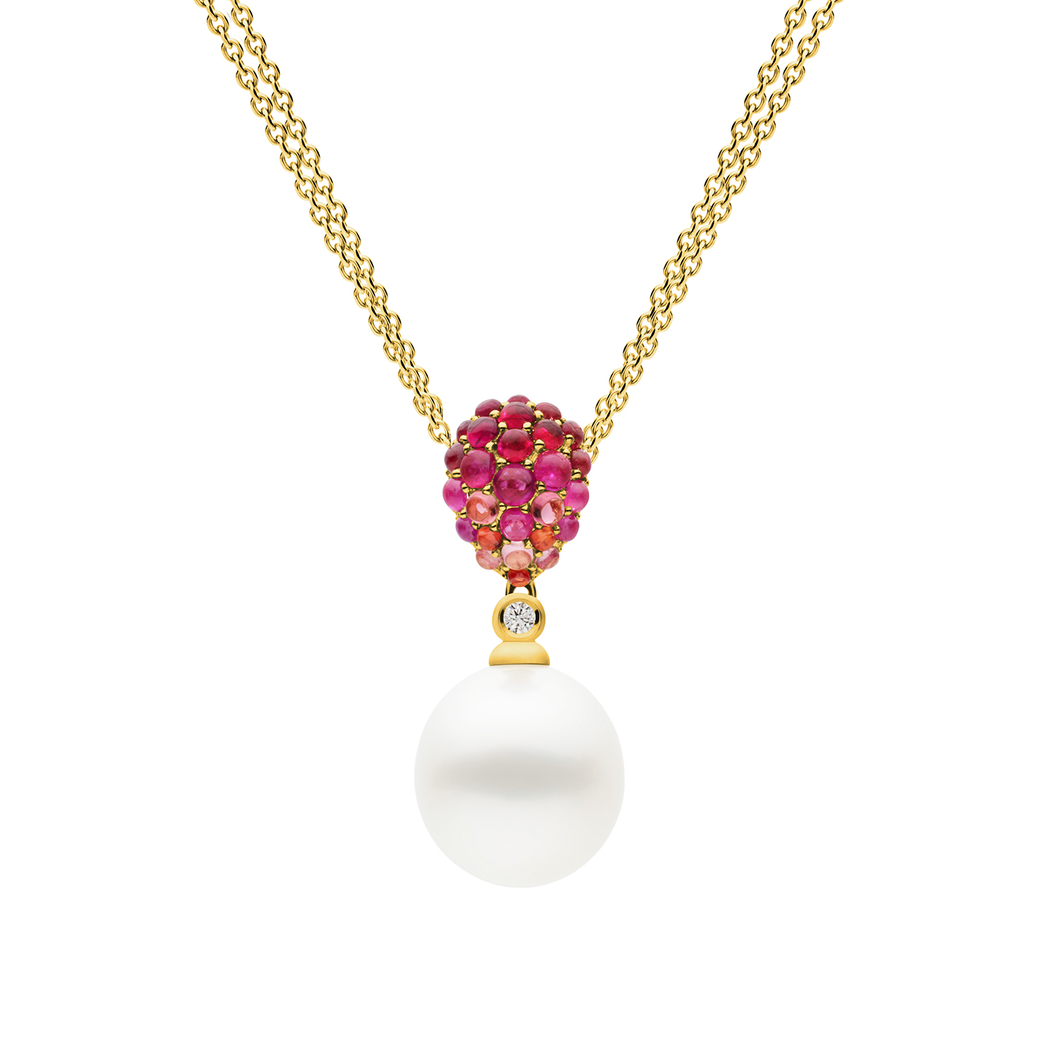 The Aurora Horizon Pendant pendant is 18ct yellow gold with grain-set Cabochon-cut Rubies, Pink Tourmalines and Orange Sapphires (27 gemstones, approx. 1.5ct); featuring a brilliant White Diamond (0.055ct) and a drop-shaped, untreated Australian South Sea pearl.