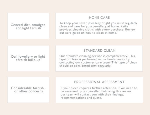 Select designs are not suited for a polishing cloth or spray – including those with a brushed finish or oxidised silver – and such pieces will need to be professionally cleaned by our team.