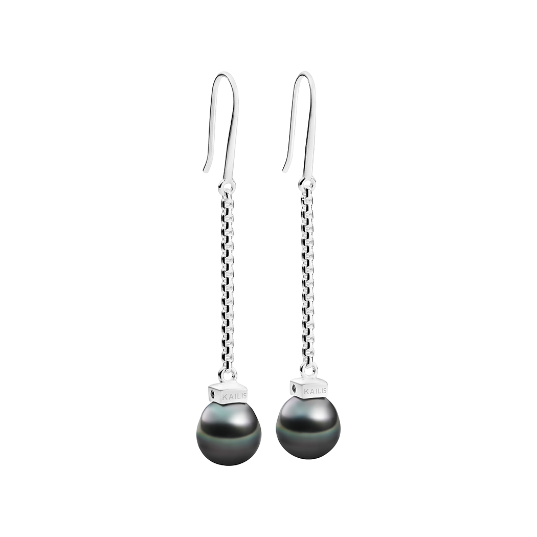 The Contempo Earrings in sterling silver are inspired by the fun, vibrant energy of the wearer. The playful movement of these French hook earrings highlights the beautiful Tahitian South Sea pearls and refined, detailed chain.