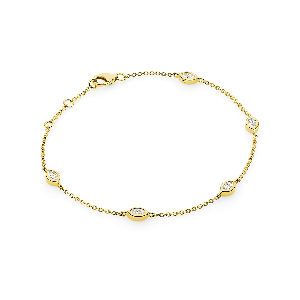 The Fleur Bracelet, Yellow Gold embraces its identity of delicate sophistication, with sparkling marquise shaped diamonds framed in 18ct yellow gold sitting like petals, nature’s most graceful adornments.