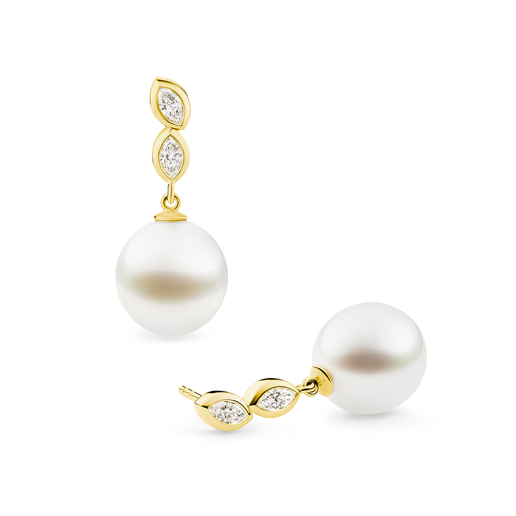 The Fleur Pearl Earrings, Yellow Gold feature an Australian South Sea drop pearl suspended from 18ct yellow gold, paired with the beauty of marquise cut white diamonds.