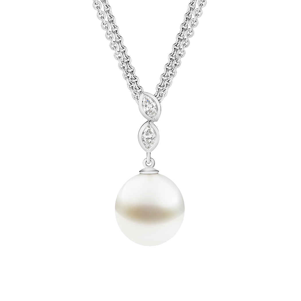 The Fleur Pearl Pendant, White Gold features marquise cut white diamonds framed in 18ct white gold in the shape of fully unfurled petals, all leading to a lustrous Australian South Sea pearl that speaks to raw and natural beauty.