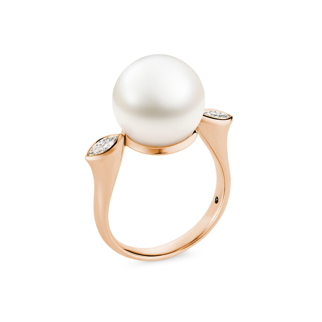 The Fleur Pearl Ring, Rose Gold embraces its identity of delicate sophistication, with sparkling marquise shaped diamonds framed in 18ct rose gold sitting like petals, nature’s most graceful adornments. At its centre, an Australian South Sea pearl glows with an unspoken promise of raw and natural beauty.