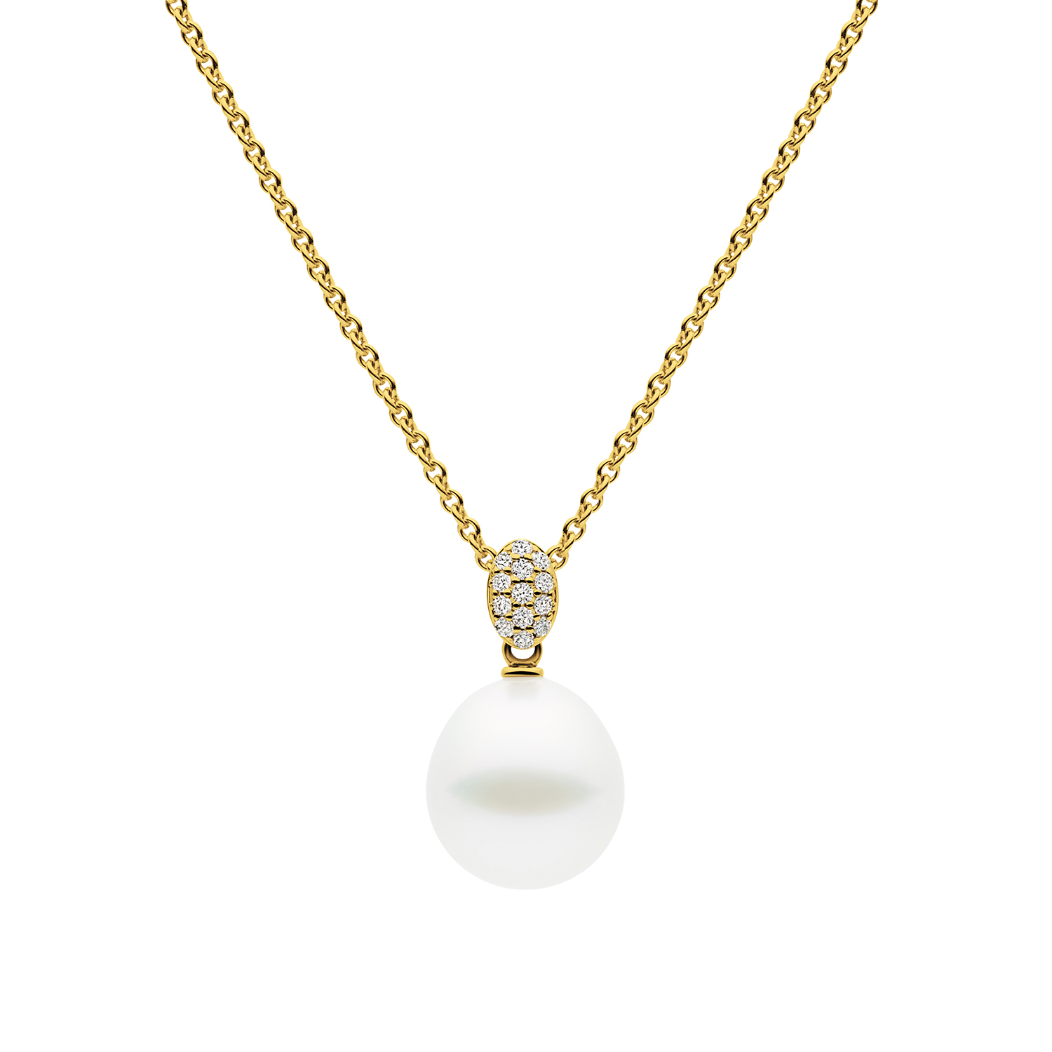 A pearl pendant that tells the story of the beautiful Galene, patroness of sailors and fishermen and personification of the calm sea, who possessed the gift of prophecy and divination. This elegant, articulated pendant features white diamonds and a drop-shaped Australian South Sea pearl set in 18ct gold.