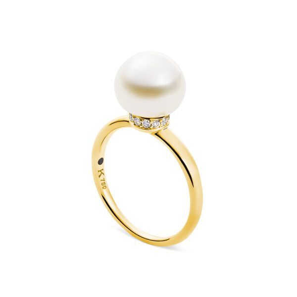 Our Celeste Ring gracefully unites yellow gold, diamonds, and pearls to create a timeless piece which honours the natural radiance of the wearer. In this refined style, a lustrous Australian South Sea pearl sits prominently over a halo of white diamonds. A slim 18ct yellow gold band gives this piece a delicate and feminine aesthetic.