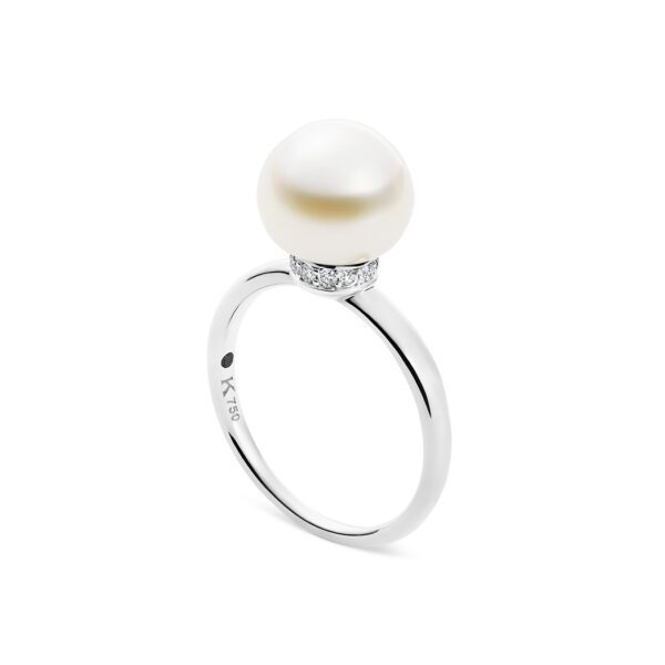 Our Celeste Ring gracefully unites white gold, diamonds, and pearls to create a timeless piece which honours the natural radiance of the wearer. In this refined style, a lustrous Australian South Sea pearl sits prominently over a halo of white diamonds. A slim 18ct white gold band gives this piece a delicate and feminine aesthetic.
