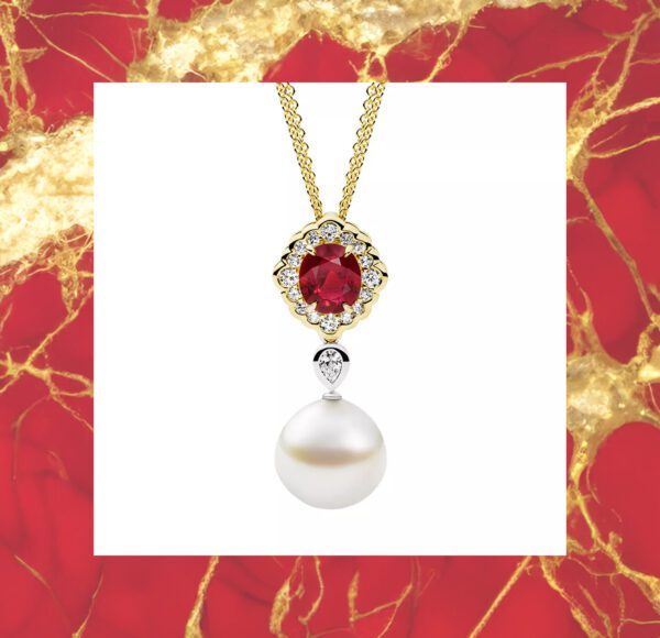 Featuring a 2.7 carat rare natural oval Burmese ruby, this piece is enchanting in its exceptionality. The centre ruby stone is haloed by 0.74 carats of sparkling white diamonds set in 18ct yellow gold. To complete the beauty of this piece, a 15mm Australian South Sea drop pearl sits articulated from a striking 0.23 carat pear cut diamond in a bezel setting.