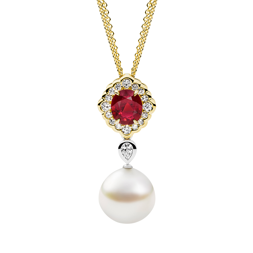Featuring a 2.7 carat rare natural oval Burmese ruby, this piece is enchanting in its exceptionality. The centre ruby stone is haloed by 0.74 carats of sparkling white diamonds set in 18ct yellow gold. To complete the beauty of this piece, a 15mm Australian South Sea drop pearl sits articulated from a striking 0.23 carat pear cut diamond in a bezel setting.