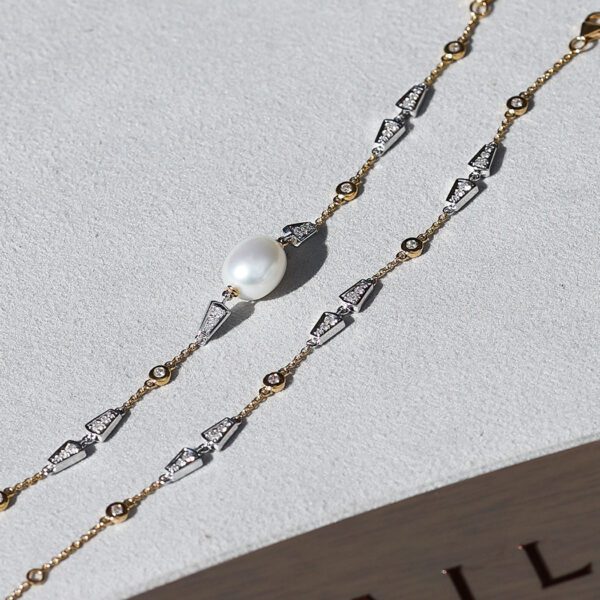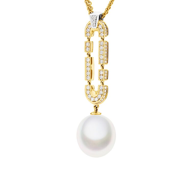 The Keystone Pendant is a perfect partnership of 18ct white and yellow gold encapsulating glittering white diamonds, leading the way to a stunning Australian South Sea pearl. Intricately structured and articulated, the Keystone Pendant offers freedom of movement, bringing it to life on its wearer. An iconic and timeless design showcasing Kailis’ exceptional craftsmanship.