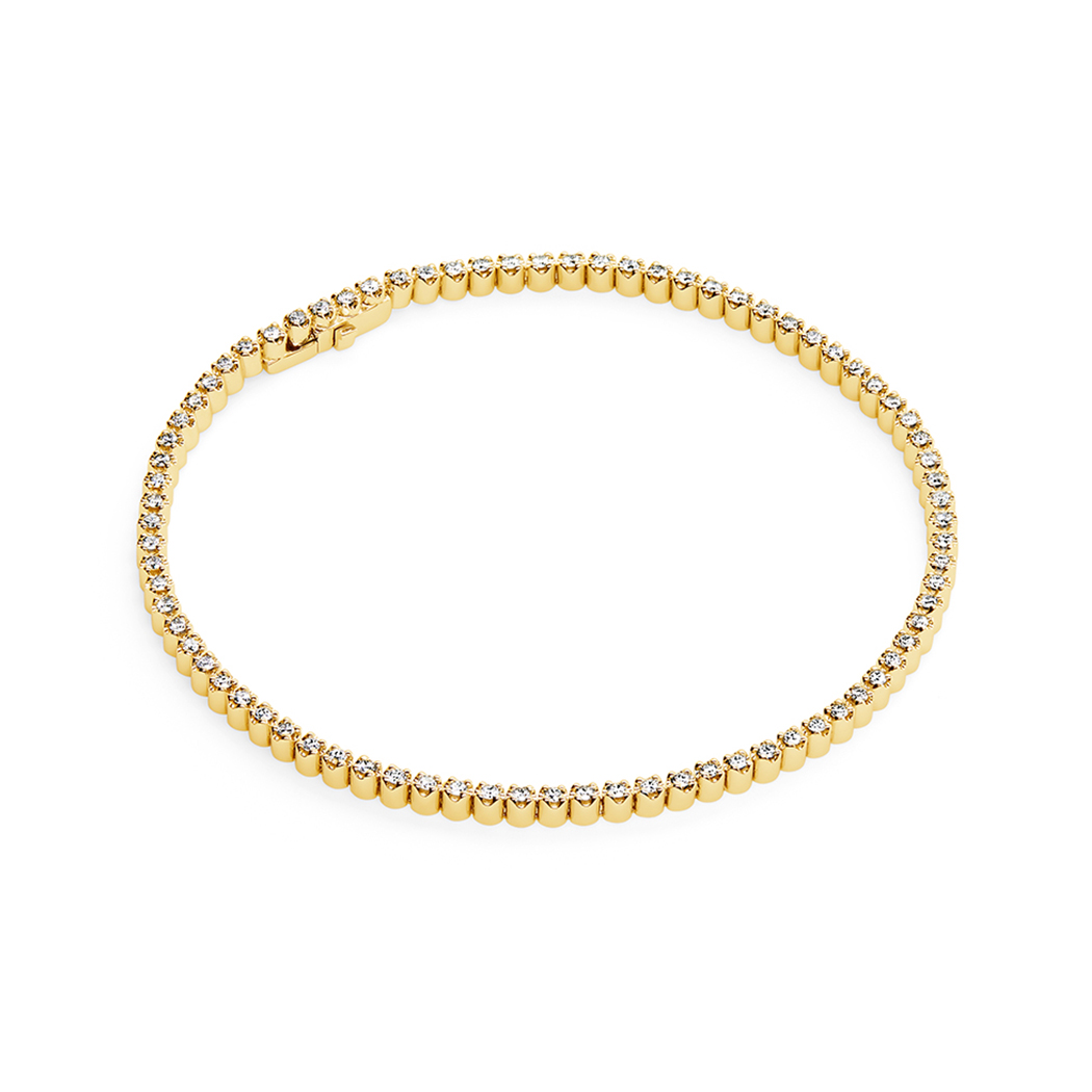 An iconic diamond bracelet design that originally got its name from being sported by players on the tennis court. This 18ct yellow gold bracelet showcases sparkling white diamonds in a combination bezel/prong setting. Bestowed with our signature secret black diamond and our ‘K’ hallmark, this piece radiates timeless elegance.