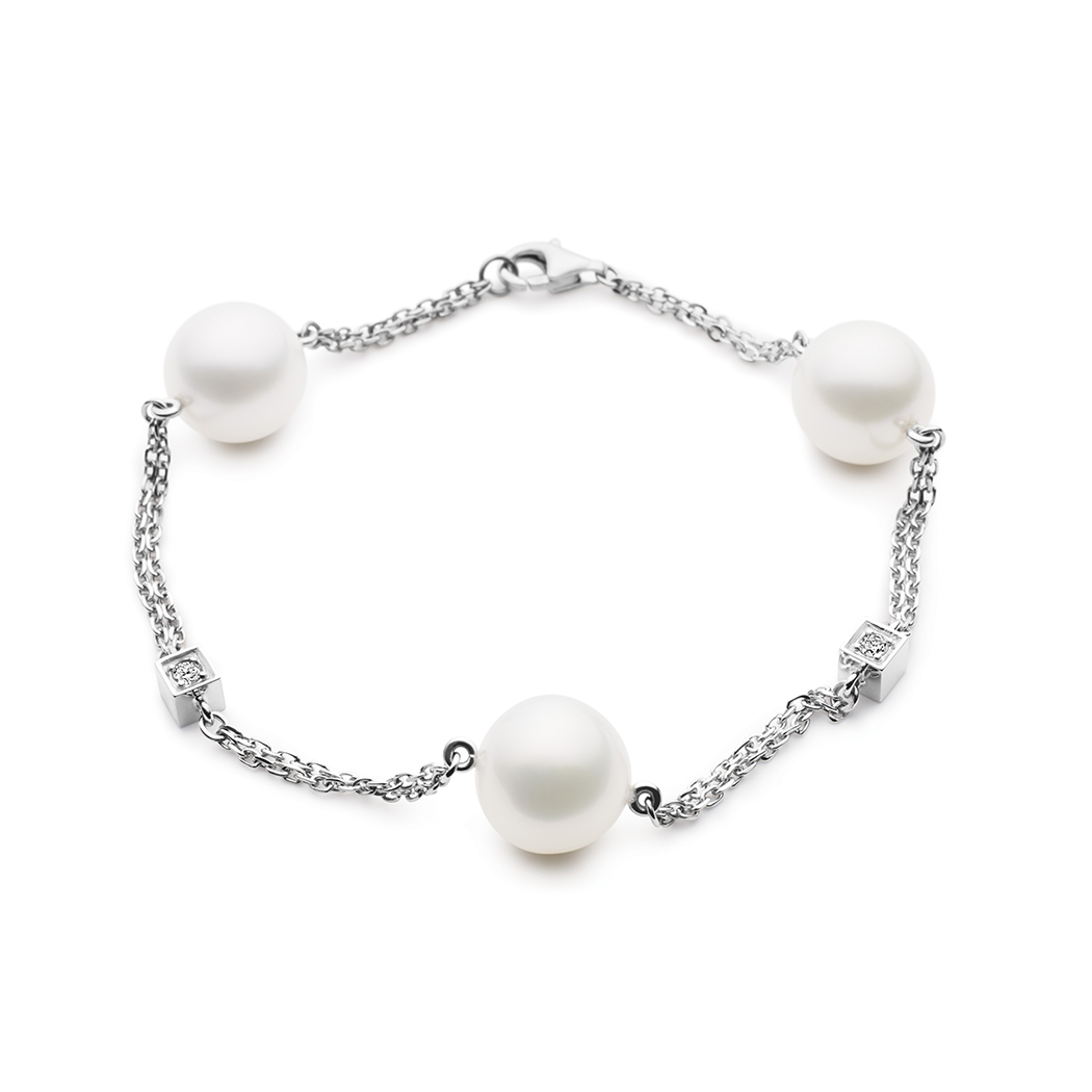 The Orion Bracelet in 18ct white gold featuring delicate chains that suspend three lustrous Australian South Sea pearls and two starry diamond cubes. The planets and stars are yours forever.