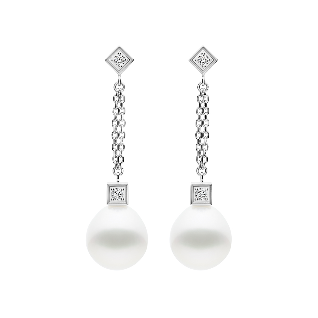The Orion Earrings are perfect for a timeless evening look. Diamond studded accents and 18ct white gold chain suspend lustrous Australian South Sea pearls to deliver eye-catching movement through the night.