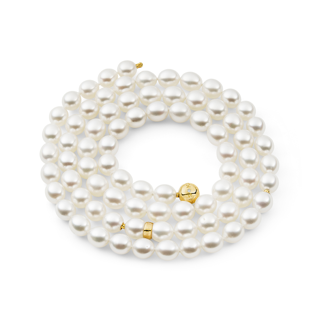 This strand offers many distinct looks, with 79 lustrous Australian South Sea oval pearls, the piece graduates in size from 9.1mm to 10.1mm. It features an 18ct yellow gold and white diamond ball clasp, with a secure push and twist mechanism.