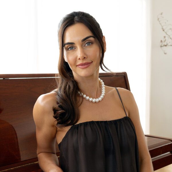 Both muses are wearing 10mm Australian South Sea round pearls.