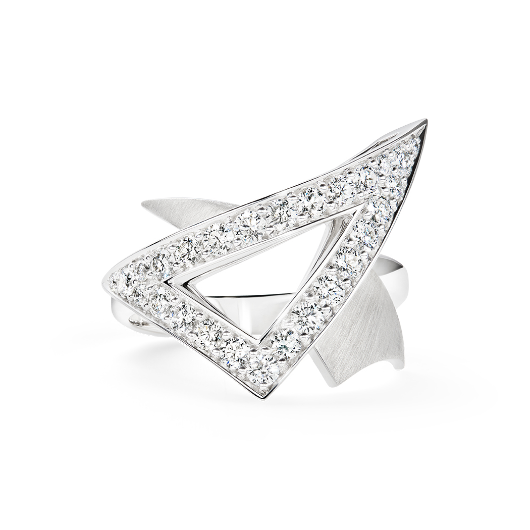 This ring features a striking contrast of brushed and high polish 18ct white gold. 0.81 carats of white diamonds fills the designsā angular shapes, like the glistening sun in a shipās sails.