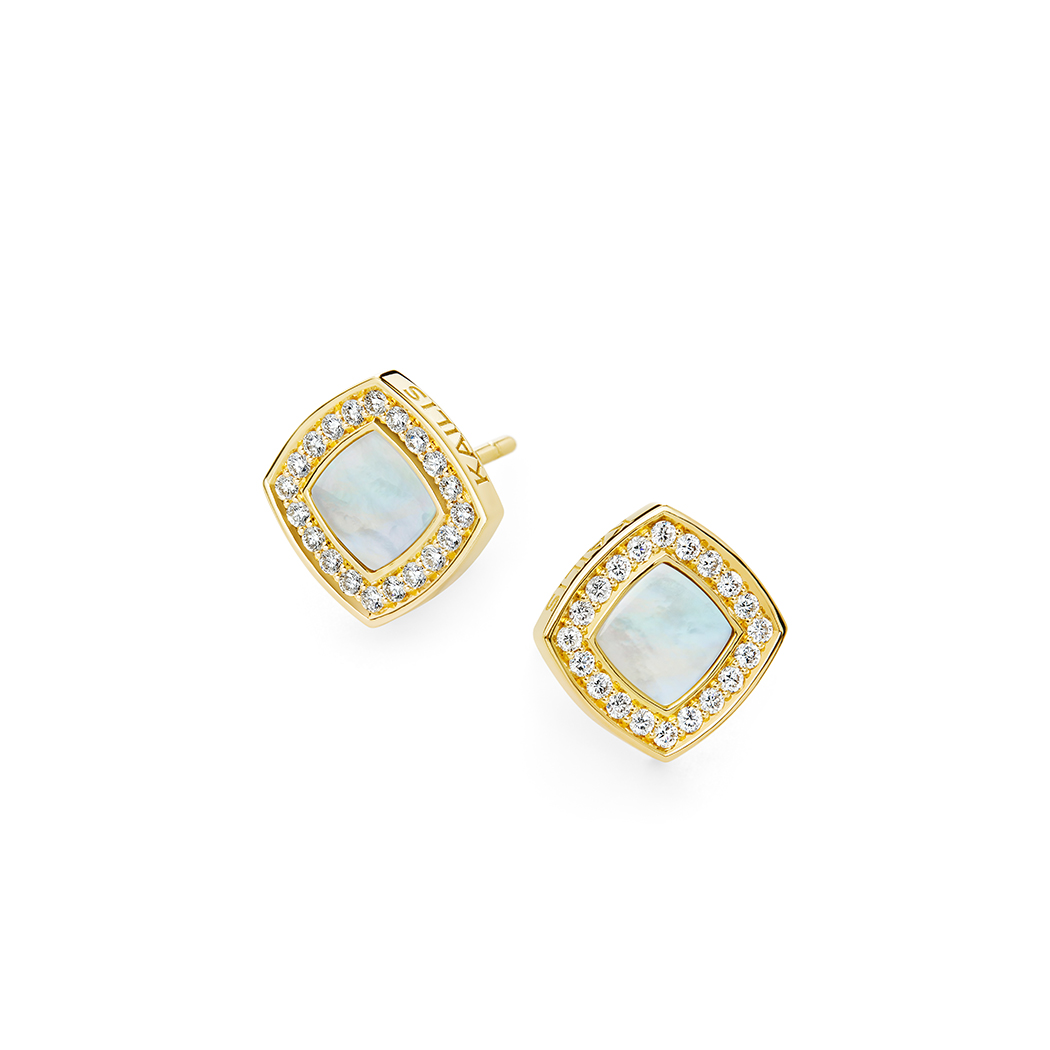 The Serene Tetrális studs embody the beauty of contrast. Defined and strong, the 18ct yellow gold base holds an inlay of sparkling diamonds and luminous Mother of Pearl, showcasing their serene beauty. The unique shape of these stud earrings reflects signature Kailis craftsmanship.