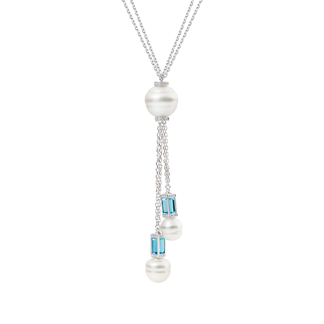 The Sugarloaf By Day Lariat features three lustrous Australian South Sea circle pearls delicately connected to a double trace chain set in 18ct white gold. Two 10-11mm pearls are gracefully suspended below vivid blue topaz stones which sparkle with white diamond accents. At the heart of the piece sits a luminous 14mm pearl.