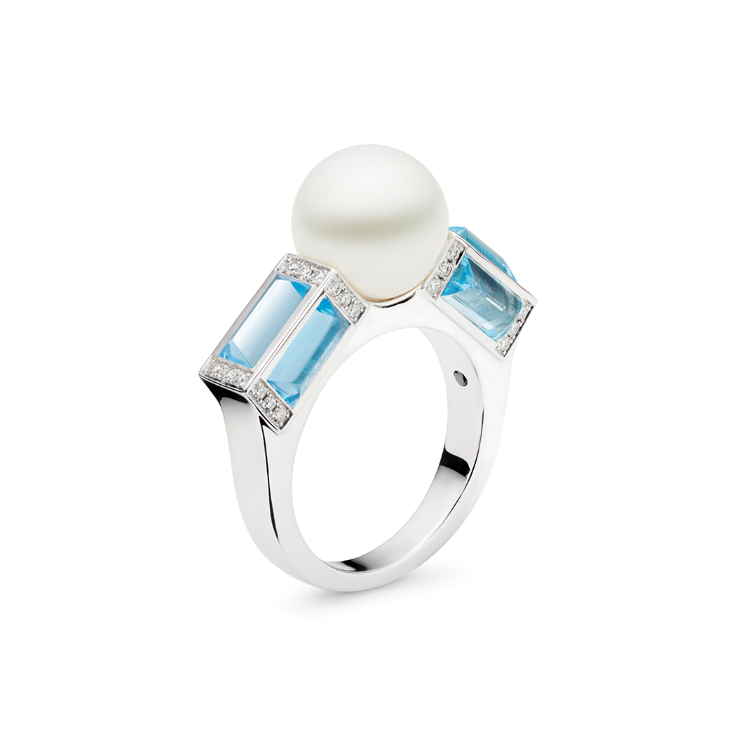 This striking ring features a 10mm round Australian South Sea pearl embraced on either side by a total of six Blue Topaz stones with a total carat weight of 3.00ct and 0.23ct of white diamond accents.