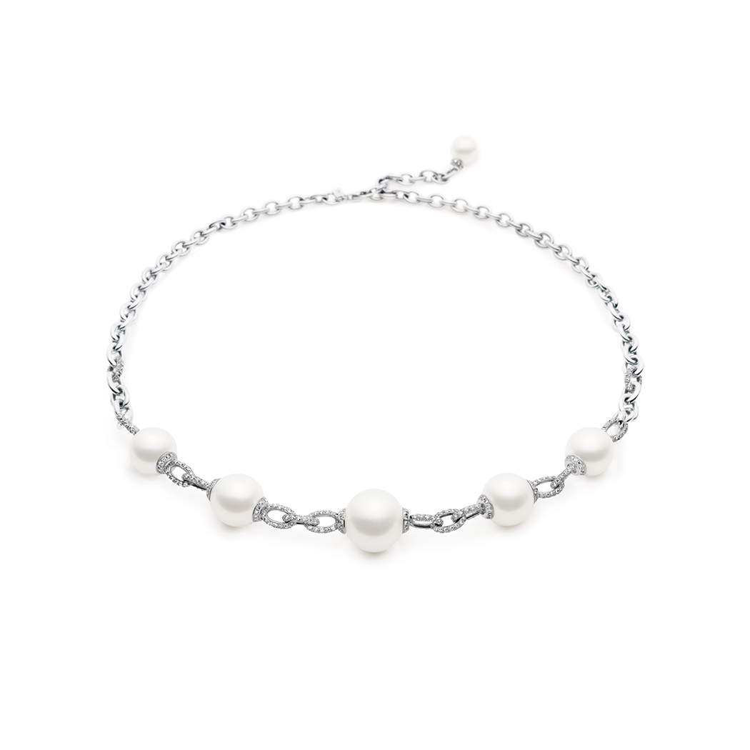 This contemporary collar combines the luxury of pearls and diamonds. The Vibrance Pearl Collar features five lustrous Australian South Sea round pearls set on a white gold chain with pavé G/VS diamonds. At its back is a beautifully discreet Australian South Sea drop pearl – your own little secret.