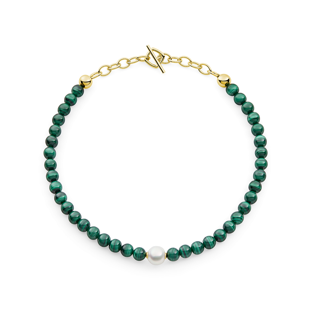 The Vigour Necklace, Malachite features striking malachite beads, complemented by a gold-plated sterling silver rondel, offering both sophistication and strength. At its core rests a radiant Australian South Sea pearl, mother nature’s ultimate gift.